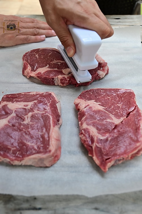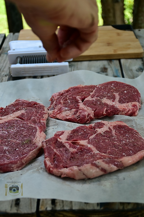 - Condimentarea: Înainte de condimentare folosește un dispozitiv de frăgezire a cărnii. Presară sare grunjoasă pe toate părțile antricotului. Lasă să stea timp de aproximativ 15-20 de minute la temperatura camerei. După ce a trecut timpul de odihnă, tamponează ușor excesul de umiditate cu un prosop de hârtie.