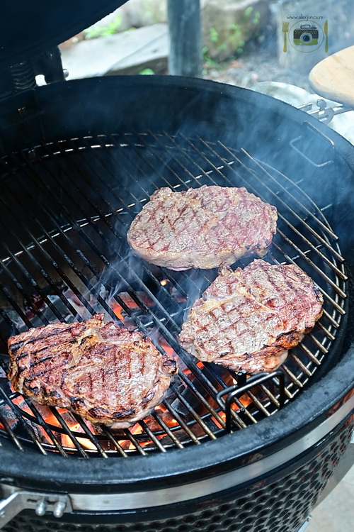 - Gătirea: Așează antricotul pe grătarul bine încins, direct peste flăcări pentru căldură directă. Gătește-l pentru aproximativ 3-5 minute pe fiecare parte, în funcție de grosimea bucății de carne și de preferințele tale pentru nivelul de gătire (în sânge, medium, bine făcut). Niciodată nu tăia un STEAK pentru a vedea dacă s-a făcut. Obișnuiește-te să încerci friptura cu degetul pentru a vedea dacă este gătită pe placul tău.