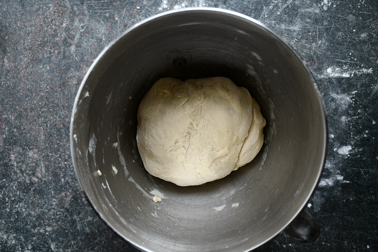 - Step 2 Adăugă făina și sarea. Pornește mixerul la viteză mică. După 2-3 minute se va lega un aluat. Scoate aluatul pe masa de lucru presărată cu făină și frământă vreo 5 minute.