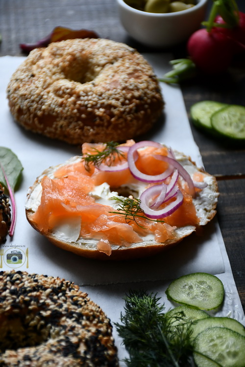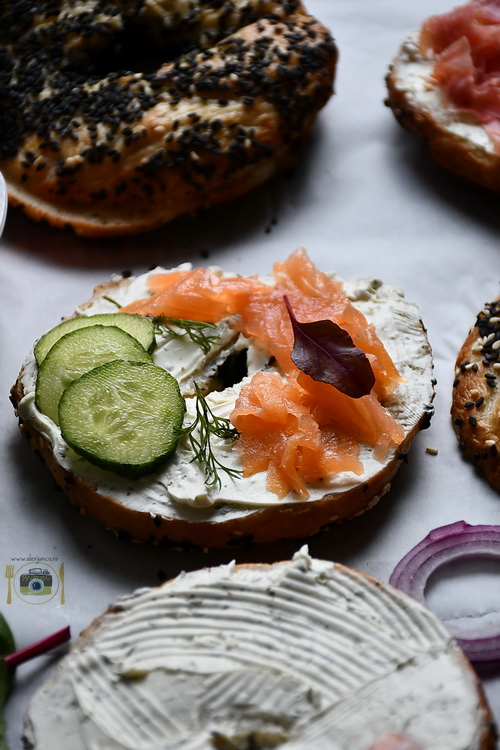 Mie personal îmi plac tăiați în jumătate unși cu cremă de brânză, felii de somon, ceapă roșie și mărar.