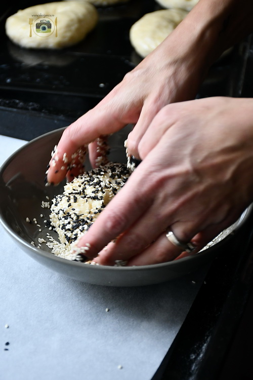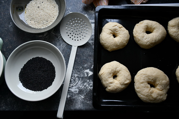 Adaugă covrigii astfel încât să aibă suficient spațiu pentru a pluti. Gătește câte 1 minut pe fiecare parte. Cu o paletă de spumă îi scoți din apă și îi lași să se odinească puțin. Pregătește semințele dacă te decizi să le folosești.