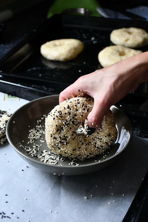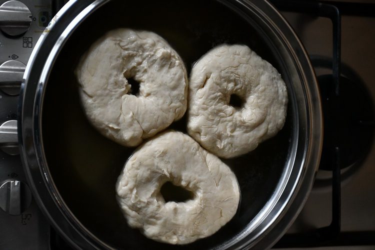 - Step 8 Adaugă covrigii astfel încât să aibă suficient spațiu pentru a pluti. Gătește câte 1 minut pe fiecare parte. Cu o paletă de spumă îi scoți din apă și îi lași să se odinească puțin. Pregătește semințele dacă te decizi să le folosești.