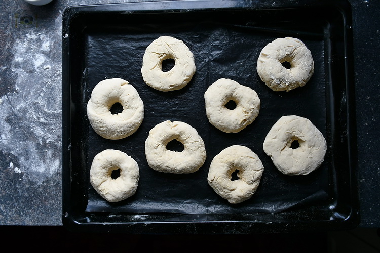 Împarte aluatul în 8 bucăți egale. Fă niște bile din aluat și trece degetul arătător prin centrul fiecărei bile pentru a face o gaură de aproximativ 5 cm în diametru.