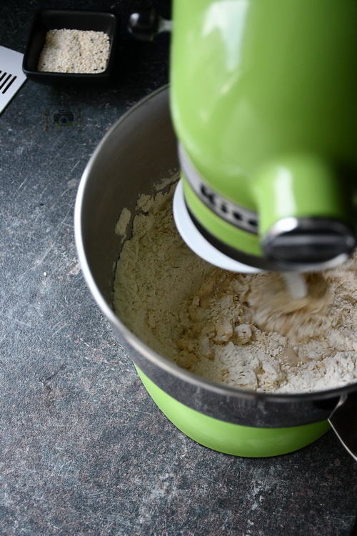 Adăugă făina și sarea. Pornește mixerul la viteză mică. După vreo 2-3 minute se va lega un aluat.