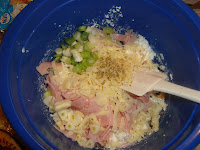 Să începem: într-un vas pun toate ingredientele și le amestec bine: telemeaua, cașcavalul ras, brânza de vaci, șunca tăiată bucatele , ceapa și usturoiul mărunțite,oregano.