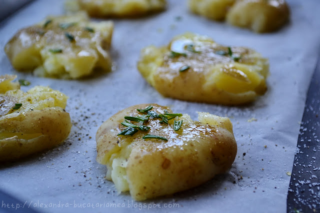 Așezați cartofi striviți într-o tavă în care ați pus hârtie de copt, condimentați cu sare de mare și piper şi pensulați deasupra amestecul de ulei cu rozmarin.