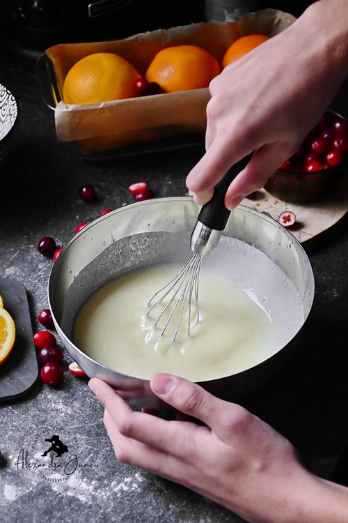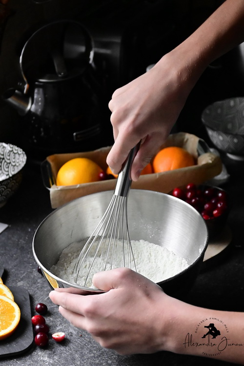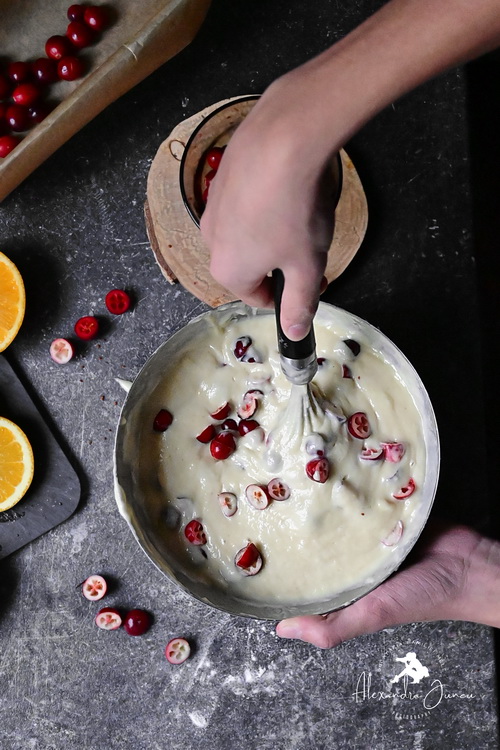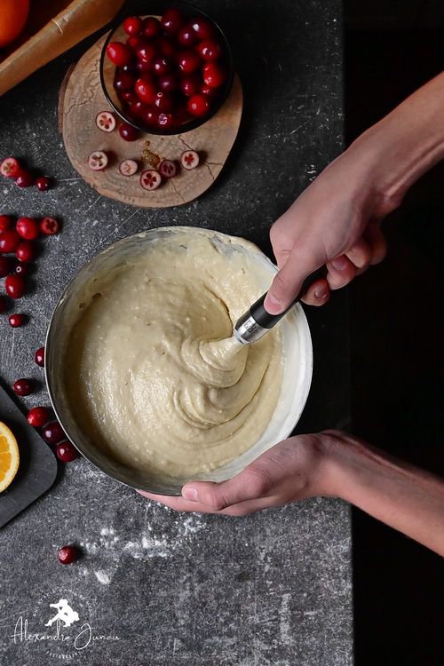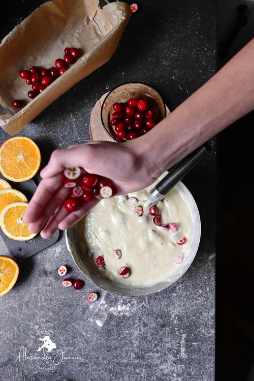 Nu amestec în exces. Adaug merișoarele și mai învârt de 2-3 ori aluatul cât să se acopere.