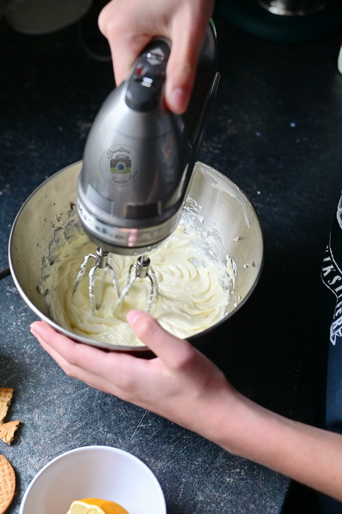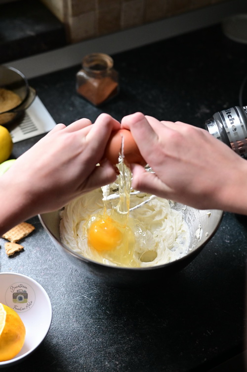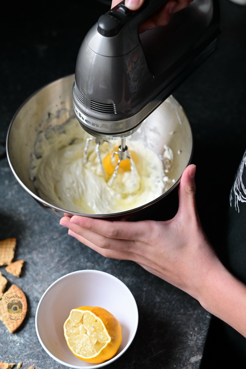 În bolul mixerului adaug crema de brânză, zahărul, extractul de vanilie și sucul de lămâie. Mixez vreo 2 minute până se transformă într-o cremă fină. Adaug apoi ouăle unul câte unul.