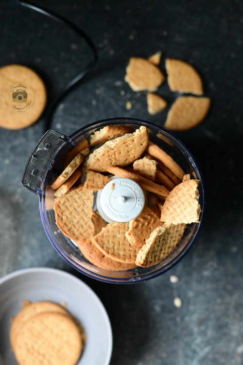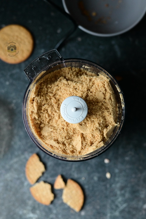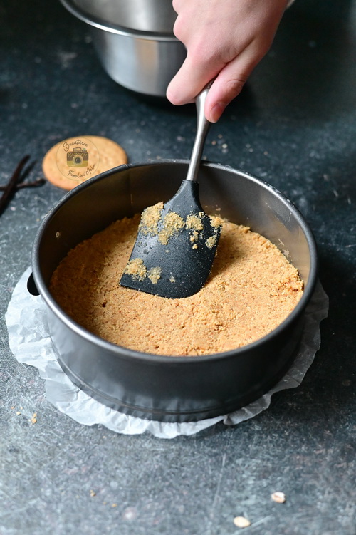 - Step 2 Într-un robot de bucătărie fac praf biscuiții. Amestec praful de biscuiți cu untul topit. Adaug și puțină scorțișoară. Torn amestecul în tava pregătită dinainte și cu ajutorul unui pahar sau spatula de silicon presez biscuiții pe fundul formei. Dau apoi la cuptorul preîncălzit vreo 5-6 minute. Scot din cuptor și las deoparte să se răcească. Cuptorul rămâne pornit.