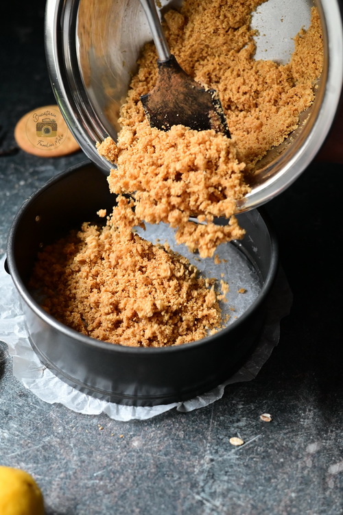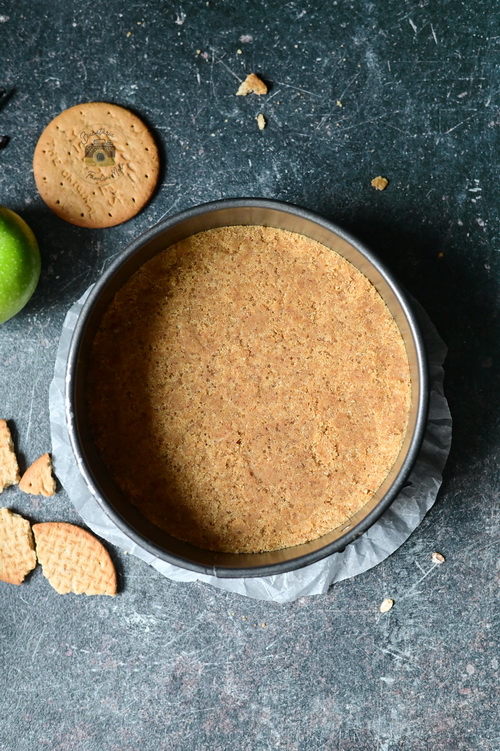 Amestec praful de biscuiți cu untul topit. Adaug și puțină scorțișoară. Torn amestecul în tava pregătită dinainte și cu ajutorul unui pahar sau spatula de silicon presez biscuiții pe fundul formei.