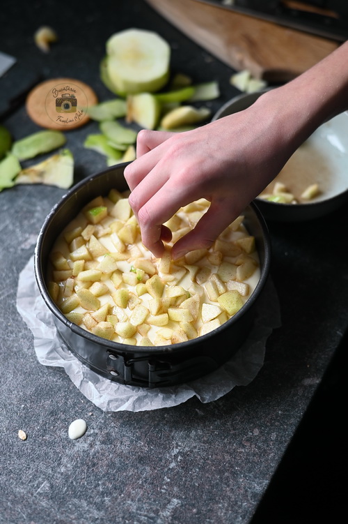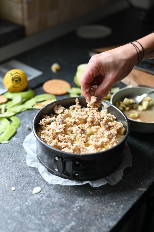 - Step 6 Peste crusta de biscuiți răcită adaug crema de brânză. Lovesc tava de masă de câteva ori până se nivelează crema sau o ajut cu o spatulă. Presar deasupra merele și apoi crumble. Nu încărcați, mai bine să vă rămână topping nefolosit decât să fie prea mult.