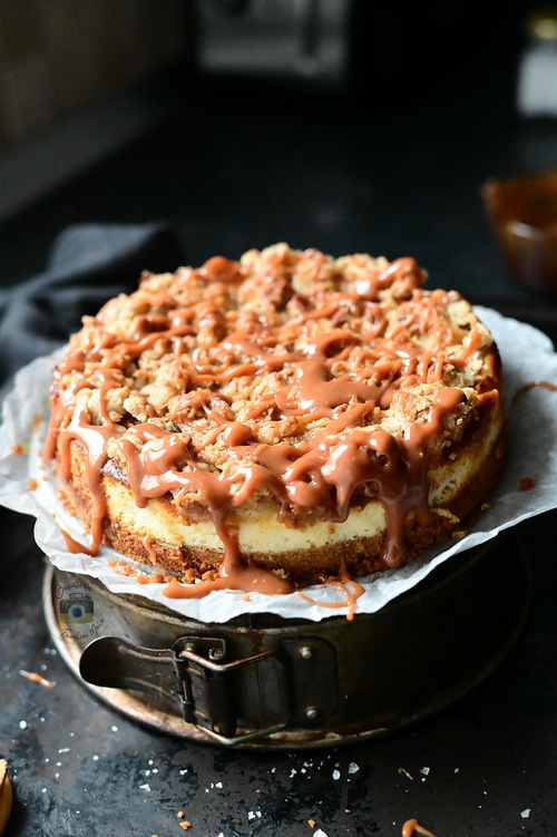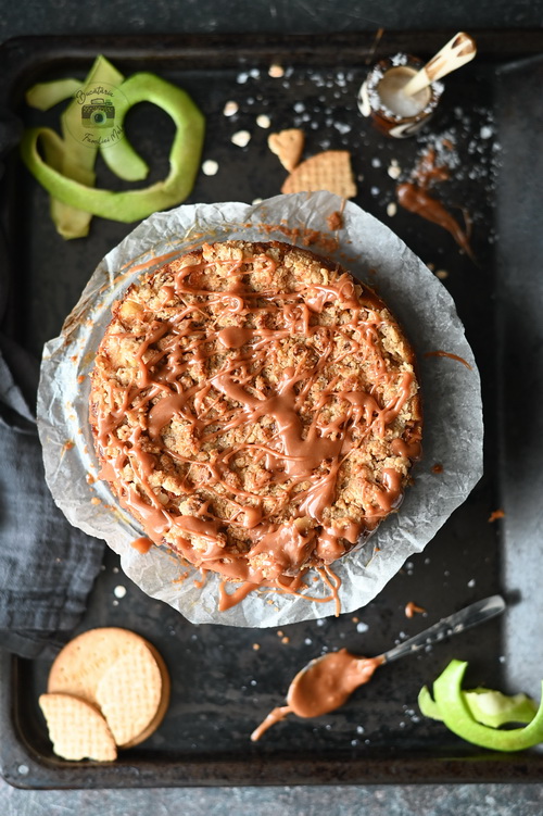 CHEESECAKE CU MERE, CRUMBLE ȘI CARAMEL SĂRAT