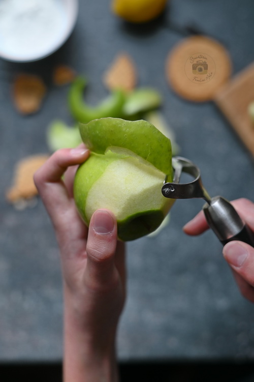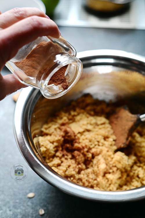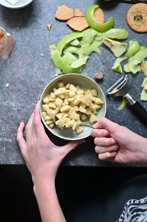 - Step 4 Curăț merele de coajă și le tai cuburi. Am nevoie de vreo 130 gr. mere cuburi. Amestec merele cu zahărul, scorțișoara și nucșoara. Dau deoparte.