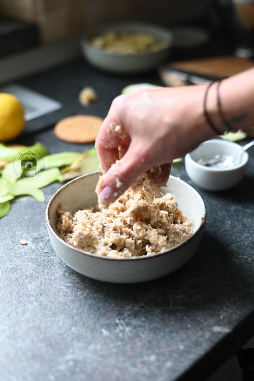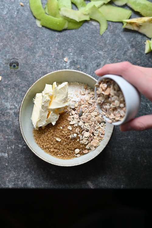 - Step 5 Pregătesc crumble amestecând fulgii de ovăz cu făina, untul la temperatura camerei și zahărul brun. Amestec cu degetele până obțin ceva sfărâmicios. Dau deoparte.