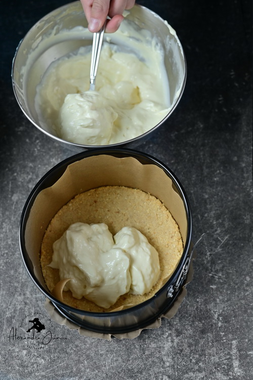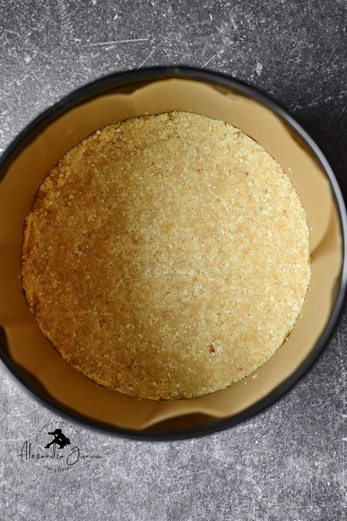 Într-un robot de bucătărie facem praf biscuiții. Amestecăm biscuiți striviți cu untul topit și zahărul, mai dăm câteva impulsuri blenderului până obținem un amestec sfărâmicios. Turnăm amestecul în tava ( 20-22 cm ) pregătită dinainte și cu ajutorul unui pahar sau spatulă de silicon presăm biscuiții pe fundul formei.