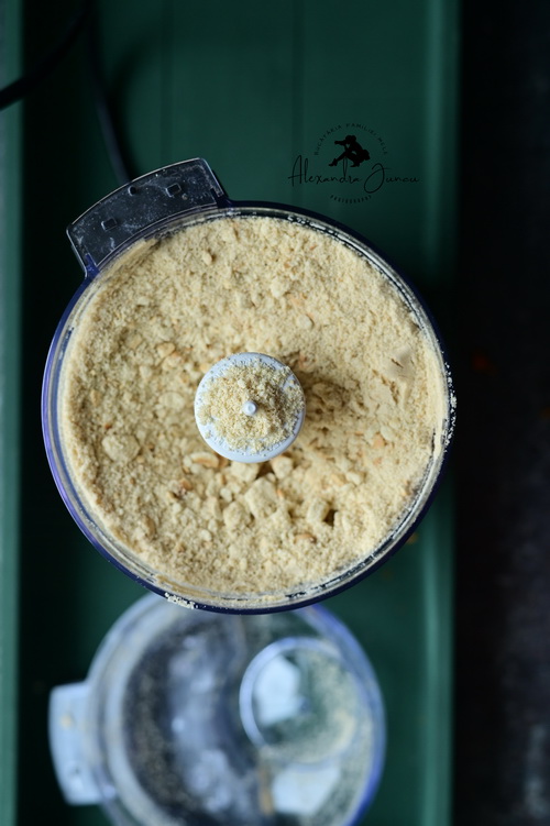 - Step 3 Într-un robot de bucătărie facem praf biscuiții. Amestecăm biscuiți striviți cu untul topit și zahărul, mai dăm câteva impulsuri blenderului până obținem un amestec sfărâmicios. Turnăm amestecul în tava ( 20-22 cm ) pregătită dinainte și cu ajutorul unui pahar sau spatulă de silicon presăm biscuiții pe fundul formei.