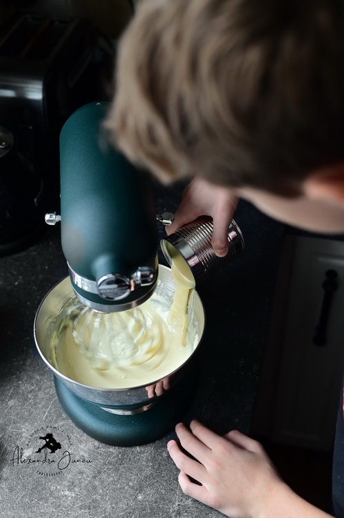 În bolul mixerului adăugăm crema de brânză și mixăm până devine pufoasă. Adăugăm apoi laptele condensat, sucul de lămâie și gelatina. Mixăm vreo 2-3 minute până se transformă într-o cremă fină. Când toate ingredientele s-au încorporat, oprim aparatul și dăm deoparte până asamblăm cheeesecake-ul.