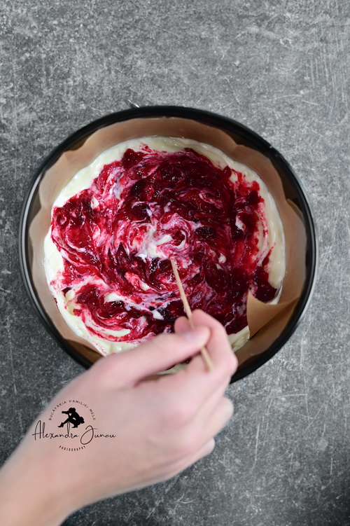Peste crusta de biscuiți răcită adăugăm jumătate din crema de brânză obținută. Adăugăm acum mai mult de jumătate din sosul de merisoare răcit. Cu ajutorul unui cutit facem 8-uri în cremă pentru a încorpora sosul. Adăugăm apoi restul de crema și sosul rămas deasupra. Repetăm 8-urile în crema până se obține un efect marmorat.
