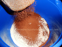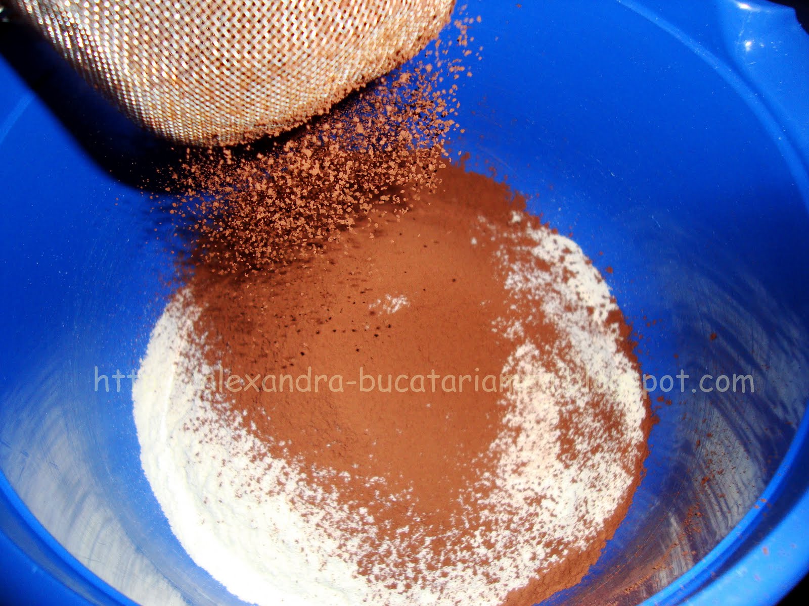 Laptele praf se cerne împreună cu cacao într-un vas.