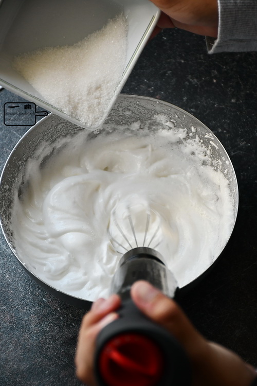 Adăugați zahărul pudră. Continuați să mixați adăugând restul de zahăr.
