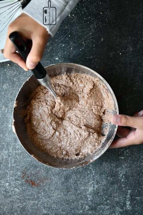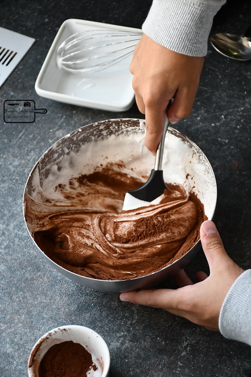 Folosind o spatulă și amestecând de sus în jos încorporați cacaua și nuca măcinată. Puneți deoparte până pregătiți aluatul.