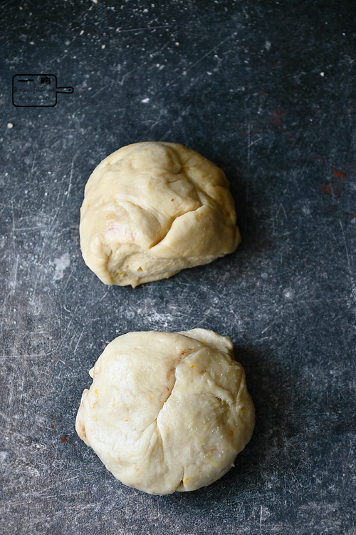 Când aluatul este gata crescut adăugați puțină făină pe masa de lucru și frământați încă vreo câteva minute. Împărțiți aluatul în 2 părți egale.