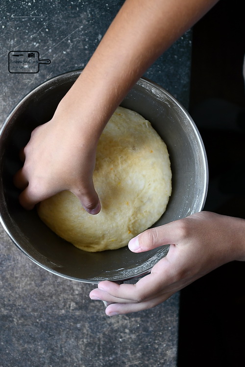 În vasul mixerului adăugați făina cernută. Faceți o gaură în mijloc unde adăugați drojdia împreună cu o lingură de zahăr și puțin lapte cald. Zahărul și laptele îl luați din cel cântărit anterior. Lăsați deoparte vreo 10 min. până face spume și se umflă.