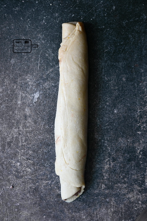 Cu ajutorul sucitorului întindeți prima parte de aluat într-o foaie dreptunghiulară. Adăugați jumătate din umplutură pe tot aluatul lăsând marginea liberă. Rulați apoi aluatul nu foarte strâns începând cu partea lungă.