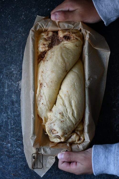 Cele două suluri de aluat le așezați în X și le împletiți. Cozonacul împletit îl așezați într-o tavă pregătită cu hârtie de copt. Acoperiți cu folie de plastic și lăsați să crească într-un loc călduros. Urmează a doua dospire, încă 15-20 minute.