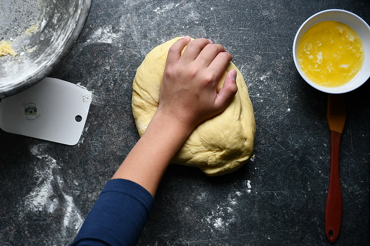 Când aluatul este crescut adaugi niște făină pe masa de lucru și pui copiii să frământe încă vreo câteva minute.