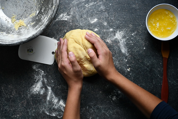 Chemi ajutoare deoarece e nevoie de frământat și copiilor le place să se murdărească. Frămânți vreo câteva minute până obții o bilă uniformă de aluat.
