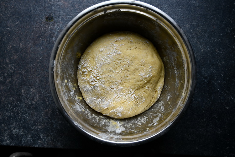 Pui bila de aluat într-un vas mare, presari niște făina și acoperi cu folie de plastic și prosop de bucătărie. E important să lași să crească aluatul într-un loc călduros fără schimbări bruște de temperatură, cum ar fi interiorul cuptorului nepornit.