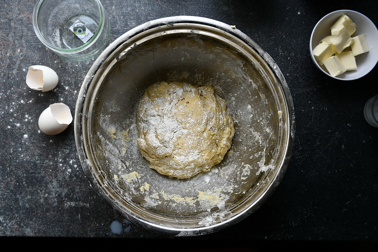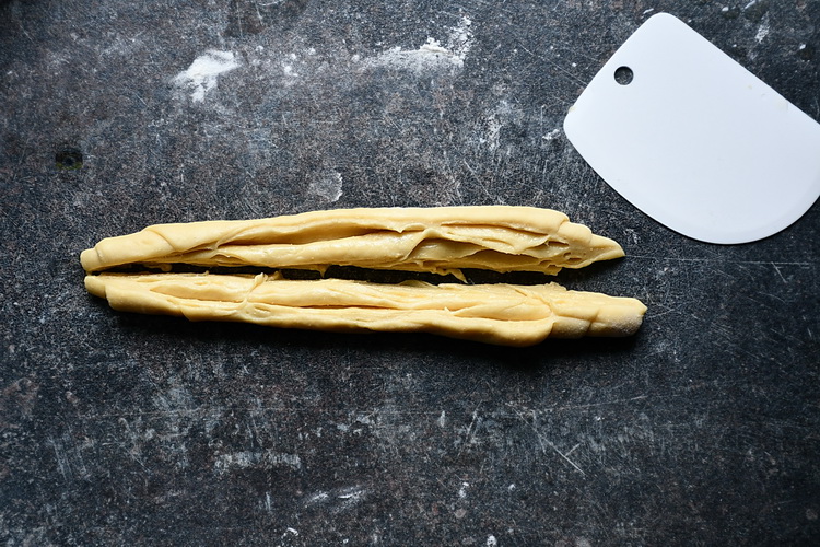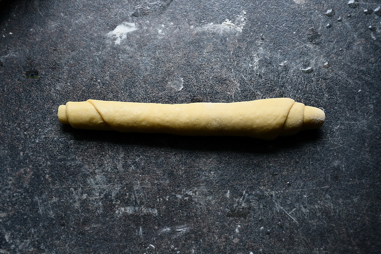 Lucrezi fiecare bucată de aluat separat. Cu ajutorul sucitorului întinzi o foaie foarte subțire. Ungi foia cu untul topit rămas și o rulezi strâns începând cu partea lungă. Tai ruloul de aluat în două pe lungime.