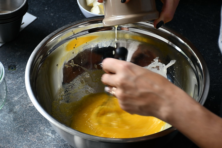 - Step 1 Într-un bol mare adaugi ouăle, zahărul, laptele și vreo 60 gr. unt topit. Amesteci bine.
