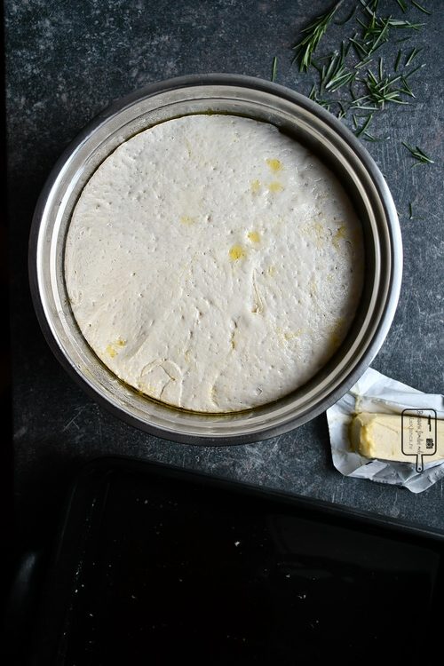 Focaccia necesită timp… de fapt planificare. Pentru o focaccia reușită începe de ieri. Un aluat lăsat să se odihnească 18 până la 24 de ore în frigider vor face foccacia mult mai aerată și pufoasă.