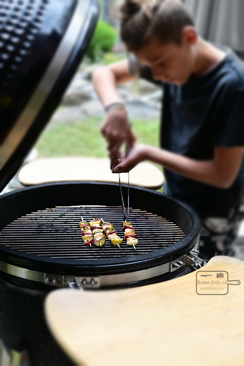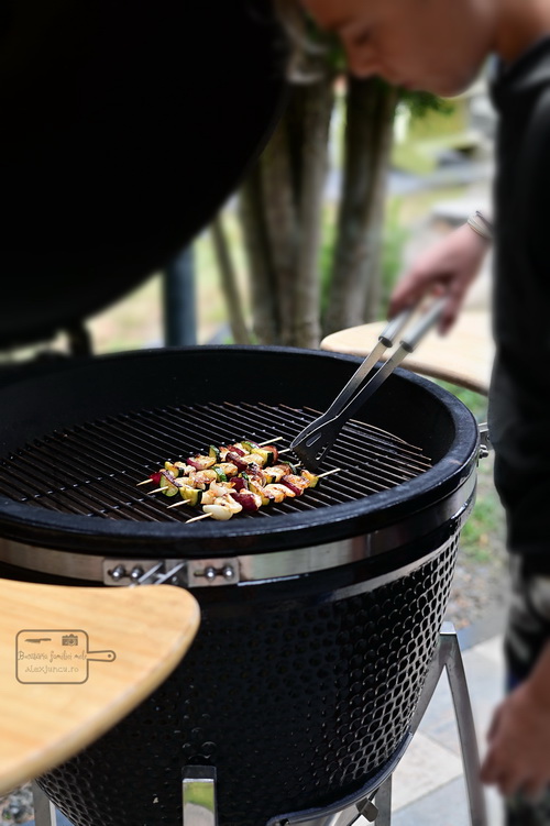 Acum că totul e pregătit urmează să prăjești frigăruile. Poți face asta fie pe grătar, fie într-o tigaie grill. Noi avem un kamado în curte și era păcat să nu ne jucăm puțin.