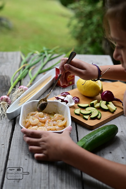 - Pe fiecare frigăruie alternează legumele cu creveții. Cam 3-4 creveți pe frigăruie.