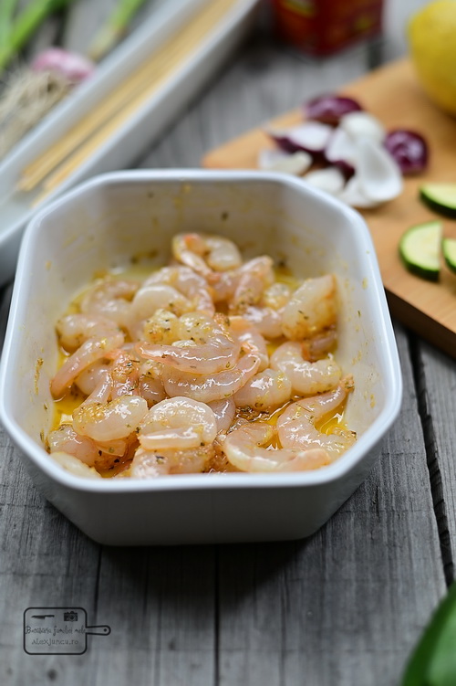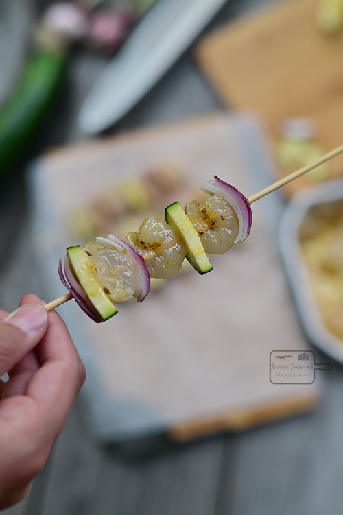 - Step 5 FRIGĂRUILE – Taie zucchini în rondele și apoi în jumătăți. Fă la fel și cu ceapa. Pe fiecare frigăruie alternează legumele cu creveții. Cam 3-4 creveți pe frigăruie.