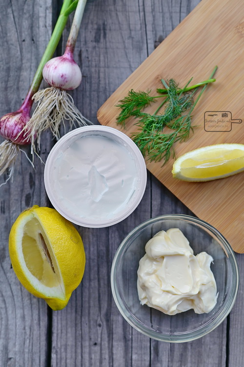 - Într-un vas combină iaurtul, maioneza, sucul de lămâie, mărarul tocat, usturoiul trecut prin presă, sarea și piperul. Amestecă până obții cu sos omogen. Dă-l la frigider până când îl vei folosi.
