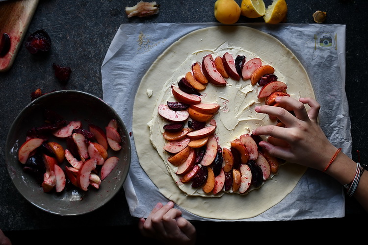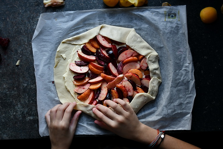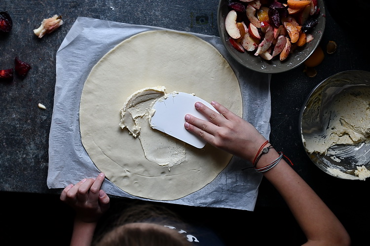 Adăugați fructele peste cremă și împăturiți marginile aluatului, lăsând mijlocul neacoperit.