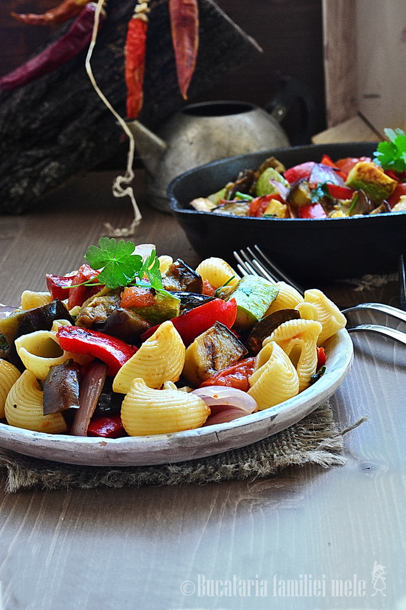 5.  Se taie legumele în bucăți mai mari, apoi se adaugă peste paste, împreună cu 2 linguri de ulei de măsline și oțet balsamic, după gust. Dacă preparatul vă iese prea uscat, puteți adăuga câteva linguri din apa în care au fiert pastele până obțineți un sos.