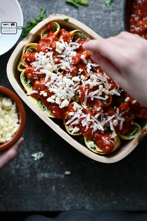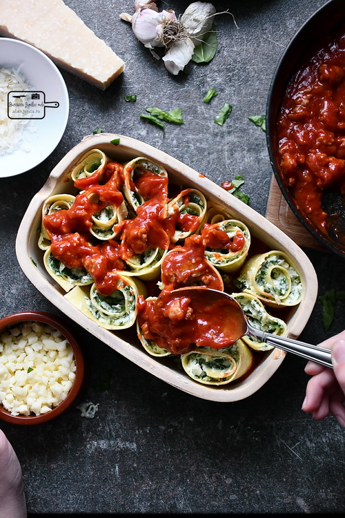 Lasagna rolls cu ricotta și spanac, în sos marinara cu salsiccia