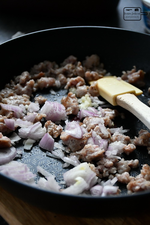 Încălzește uleiul de măsline într-o tigaie mare. Adaugă ceapa și cârnatul scos din înveliș și călește totul la foc mediu, 5 până la 10 minute. Adaugă usturoiul și mai gătește încă 1 minut.