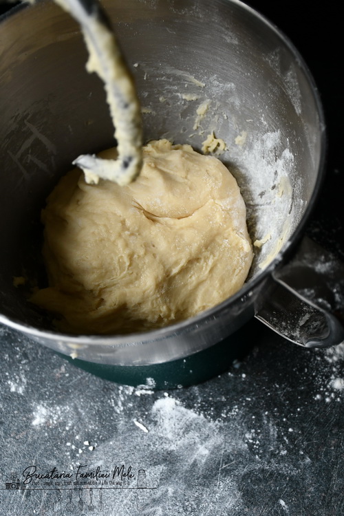 La mixerul din dotare atașezi cârligul pentru aluat. Adaugi în bol amestecul de drojdie, ouăle puțin bătute cu furculița, untul topit și restul de zahăr. Amesteci la viteza medie până se combină.