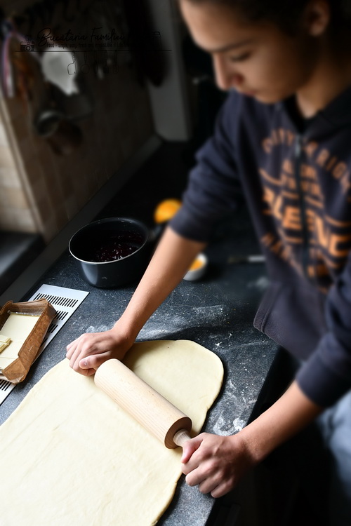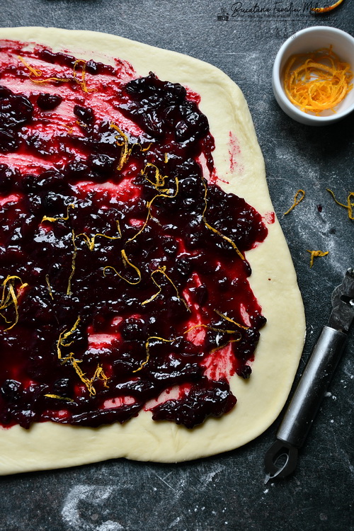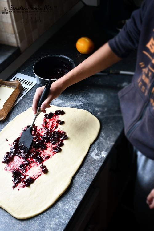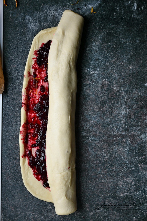 Aluatul crescut îl ciupești pentru a elibera aerul și apoi îl întinzi pe planșeta presărată cu făină. Întinzi o foaie dreptunghiulară peste care adaugi sosul de merișoare până la 1 cm de la margine. Presari coaja de portocale.