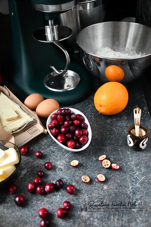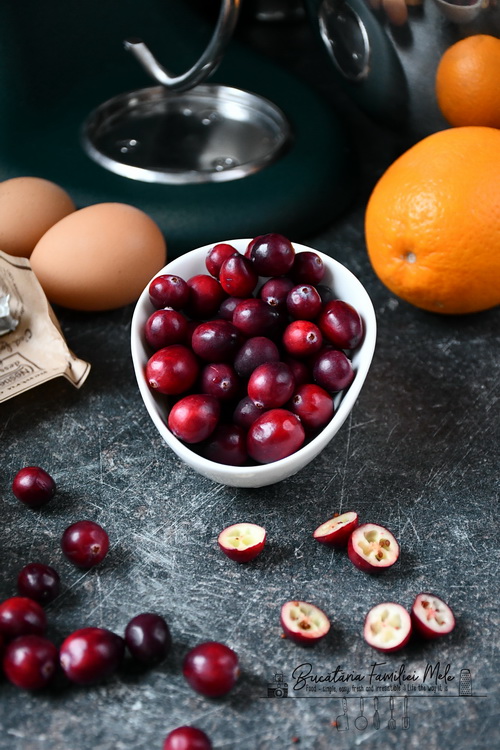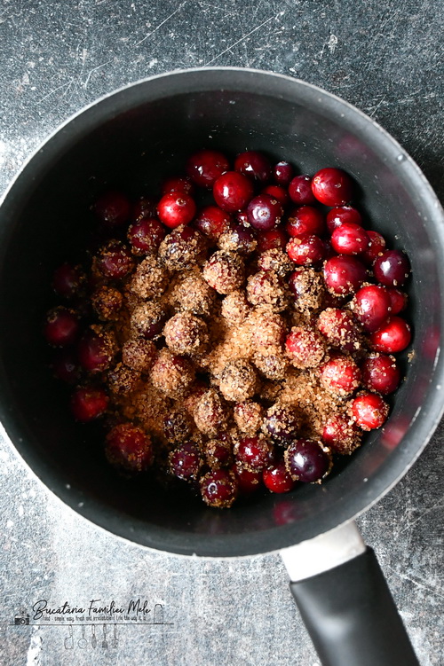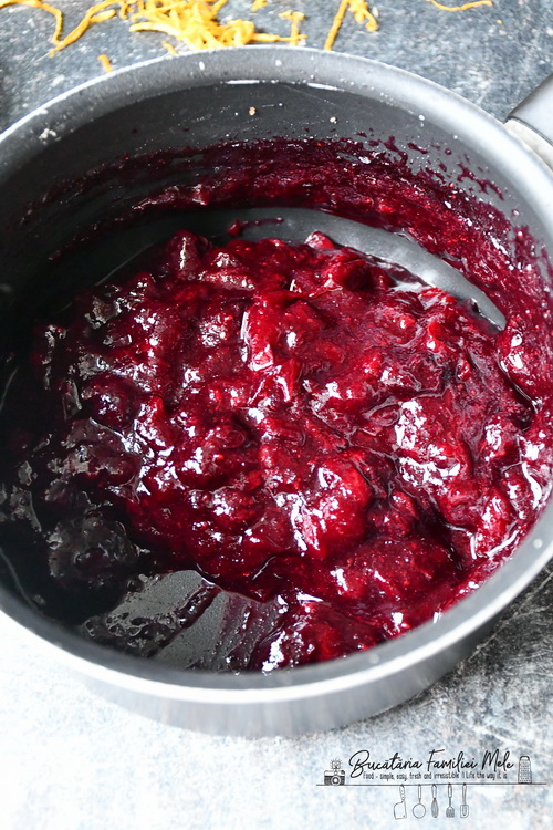 Între timp faci umplutura. Într-o oală mai mică adaugi merișoarele, apa și zahărul. Pui la fiert la foc mediu și lași să fiarbă până se reduce. Să nu uiți să amesteci ocazional altfel se arde și se afumă. Cu ajutorul unei spatule strivești merișoarele și mai lași puțin să fiarbă. Când sosul începe sa se lege îl dai deoparte și îl lași la răcit.
