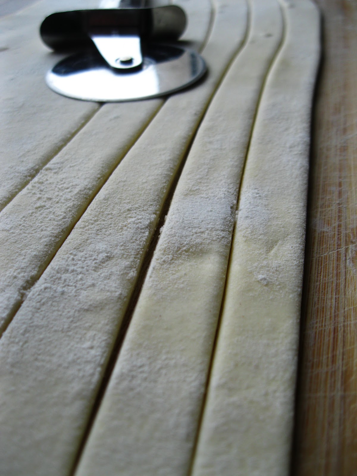 Pe jumătatea de foaie goală se întinde cu pensula niște apă și se împăturește peste partea umplută deja și se presează bine. Apoi cu cuțitul de pizza tăiați aluatul fășii cam de 2-3 cm.