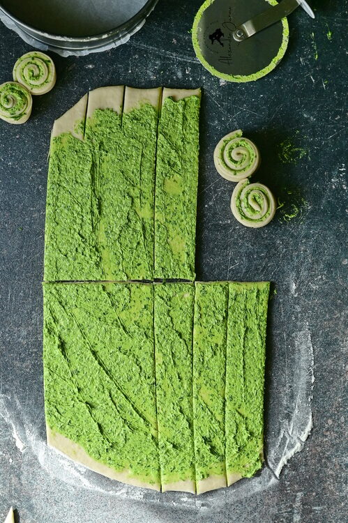 Ung aluatul cu untul aromat și tai în fâșii cu cuțitul de pizza, ca în fotografii.