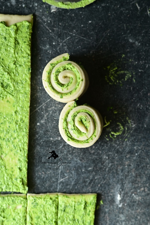 Așez rulourile de aluat apropiate intr-o tava cu arc unsa cu unt. Eu am calculat după dimensiunea tavii ( am folosit o tava de 18 cm) și mi-au încăput 12 rulouri.