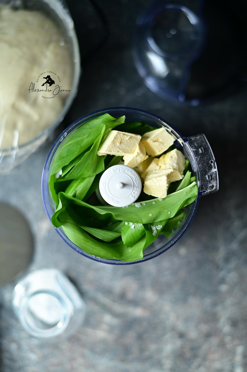 - 100 gr. unt (rețeta mea în link) + un vârf de cuțit de sare + 30 gr. leurdă proaspătă mărunțită